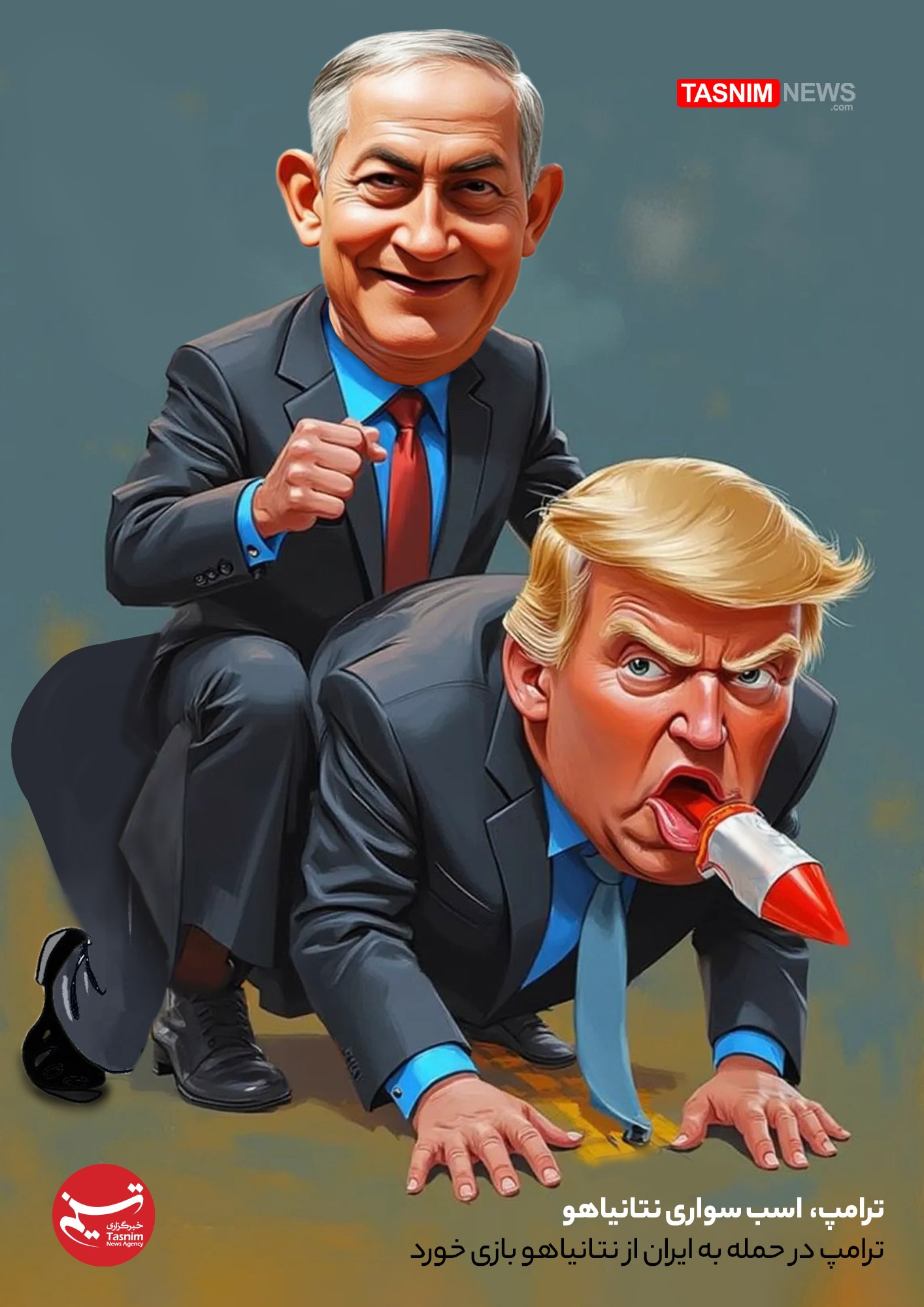 کاریکاتور/ ترامپ، اسب سواری نتانیاهو / ترامپ در حمله به ایران از نتانیاهو بازی خورد