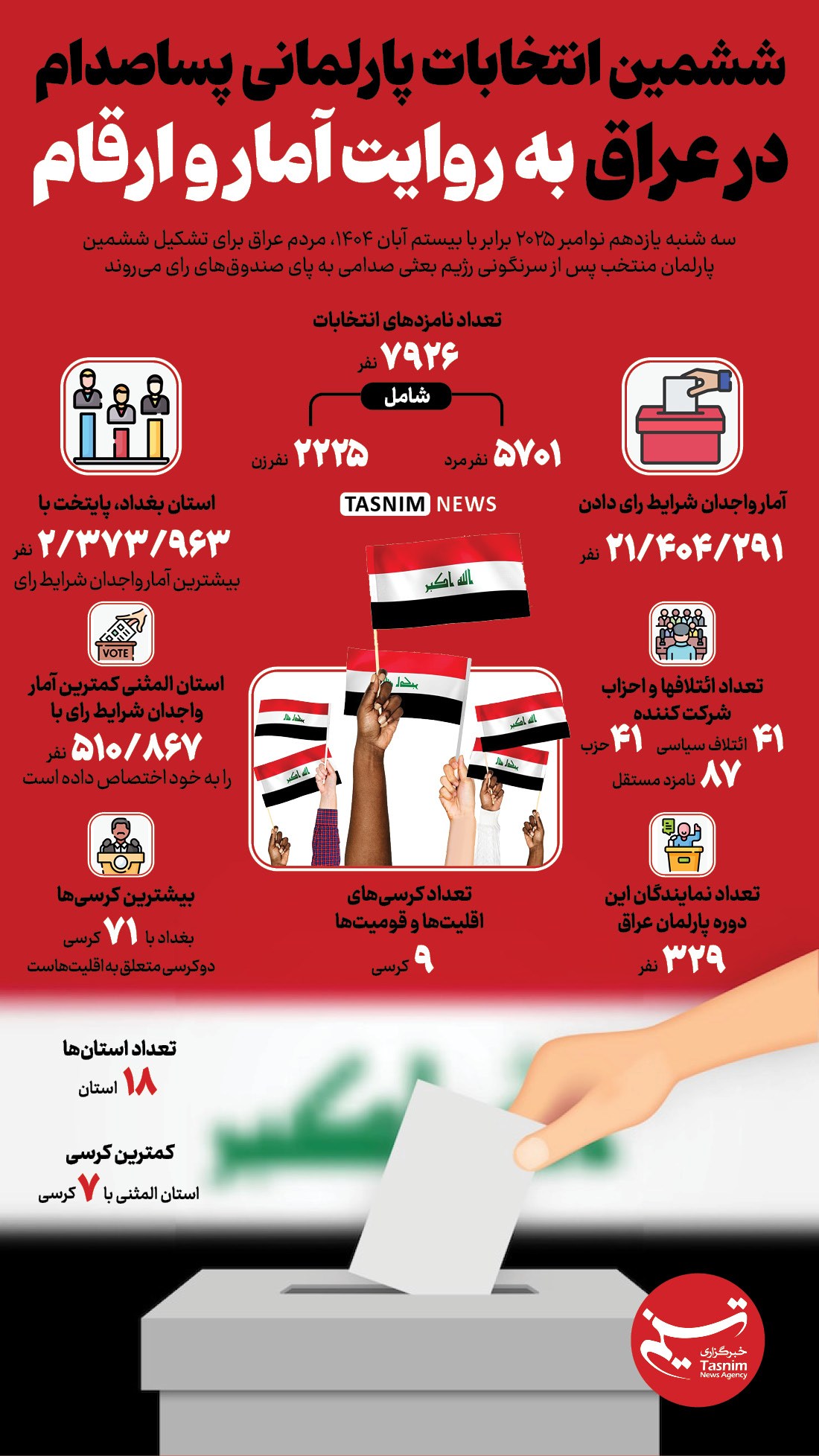 سه شنبه یازدهم نوامبر 2025 برابر با بیستم آبان 1404، مردم عراق برای تشکیل ششمین پارلمان منتخب پس از سرنگونی رژیم بعثی صدامی به پای صندوقهای رای میروند.