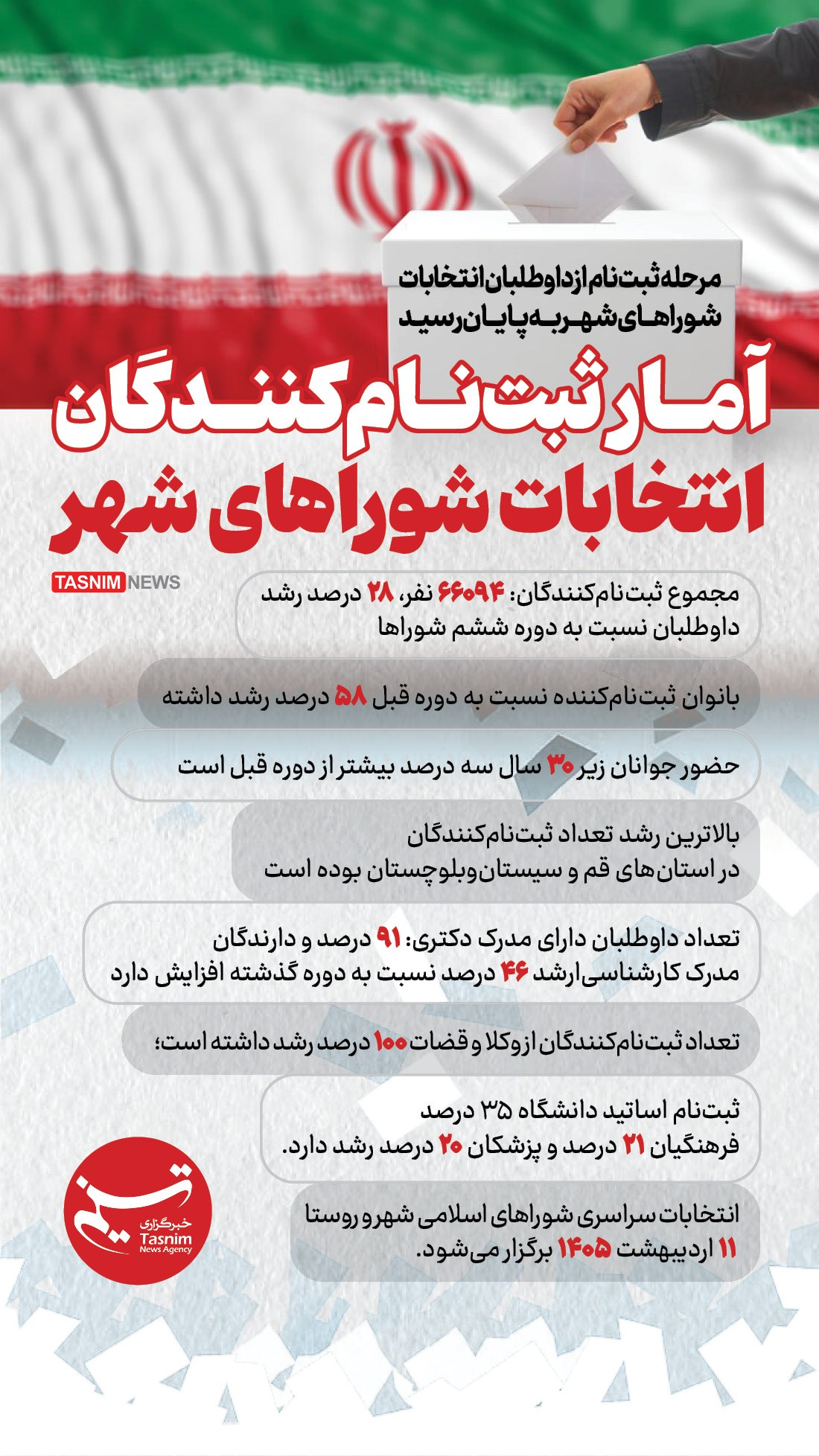 مرحله ثبتنام از داوطلبان انتخابات شوراهای شهر به پایان رسید. 66هزار و 94 نفر برای انتخابات شوراهای شهر ثبتنام کردند که 28درصد رشد را در نامنویسی داشتیم.