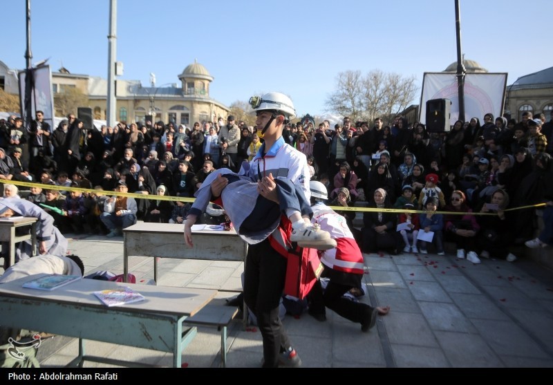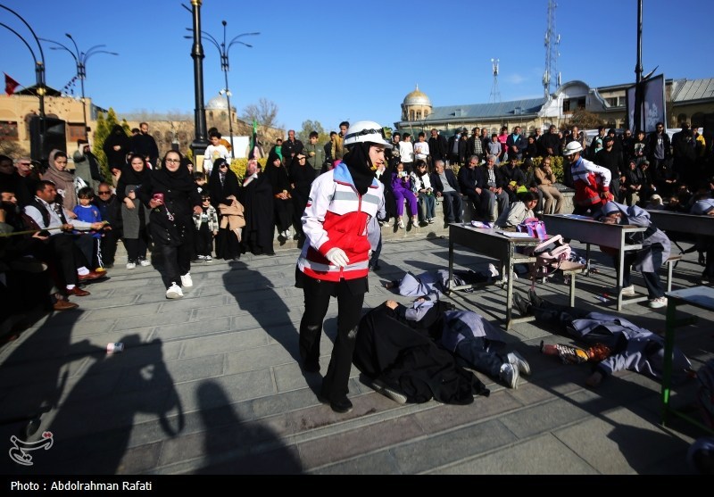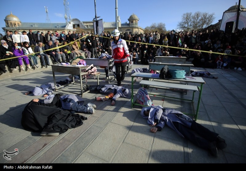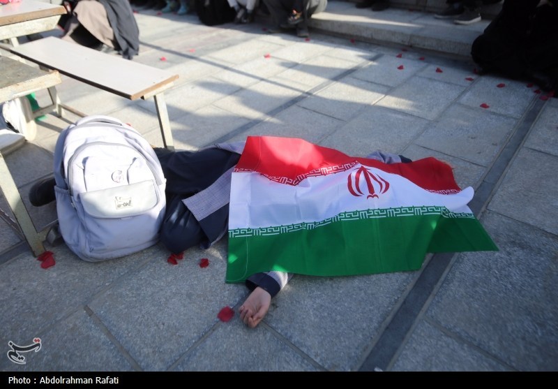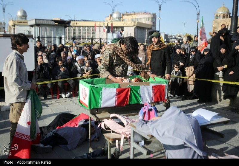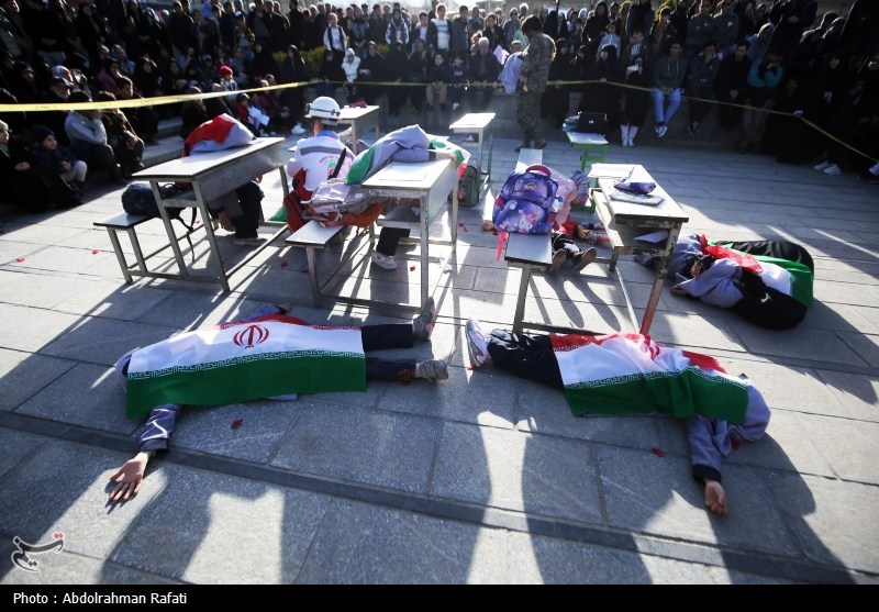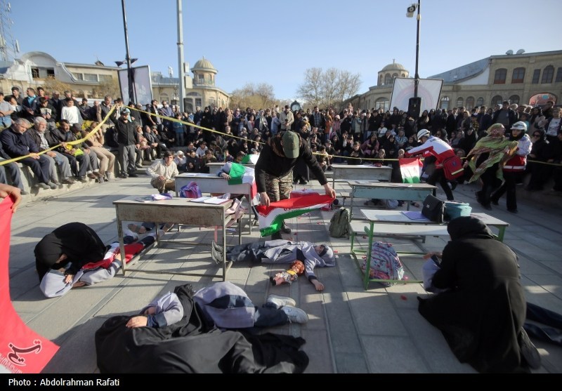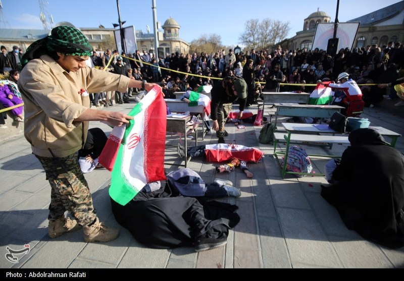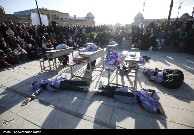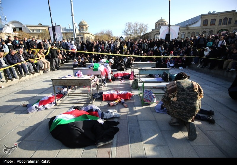 نمایش خیابانی زنگ بهشت با موضوع حمله جنایتکارانه آمریکایی صهیونی به مدرسه شجره طیبه میناب، در میدان امام خمینی (ره) همدان به اجرا درآمد.