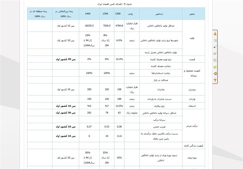 برای قرار گرفتن سرانه تولید ناخالص داخلی کشور در بین 50 کشور اول دنیا در سال 1404، سرانه تولید ناخالص داخلی باید بیش از 200 میلیون ریال باشد. بنابراین در سال 1404 تولید ناخالص داخلی کشور باید بیش از 18000 هزار میلیارد ریال به قیمت ثابت سال 1389 باشد. رشد اقتصادی تا سال 1394 بر اساس مصوبات برنامه پنجم توسعه، 8درصد در نظر گرفته شده است که با این مقدار رشد تولید ناخالص داخلی کشور در سال94 بیش از7000 هزار میلیارد ریال خواهد شد. بنابراین برای دستیابی به هدف تولید ناخالص داخلی در سال 1404 رشد اقتصادی از سال 94 تا 1404 باید 10درصد باشد. لازم به ذکر است سرانه تولید ناخالص داخلی بر مبنای برابری قدرت خرید در سال 1389 برابر 12 هزار و 100 دلار بوده است.