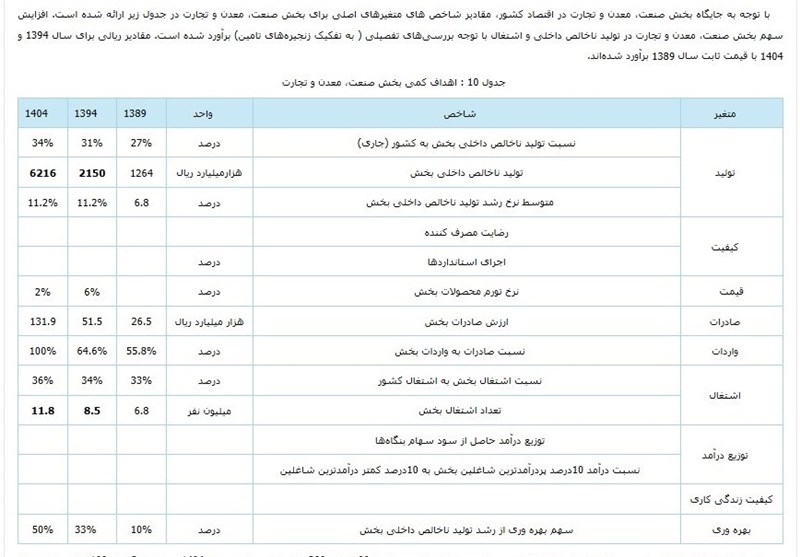 در بخشی از این برنامه راهبردی که گروه اقتصادی خبرگزاری تسنیم به آن دست یافته است، شاخص های اقتصادی کلان و بخش صنعت در سالهای 1394 و 1404 پیش بینی شده است که بر این اساس، نرخ رشد اقتصادی ایران در سال 1404 برابر 10 درصد، نرخ تورم 2 درصد و نرخ بیکاری 4 درصد پیش بینی شد و نرخ رشد بحش صنعت نیز در این سال 11.2 درصد برآورد گردید.