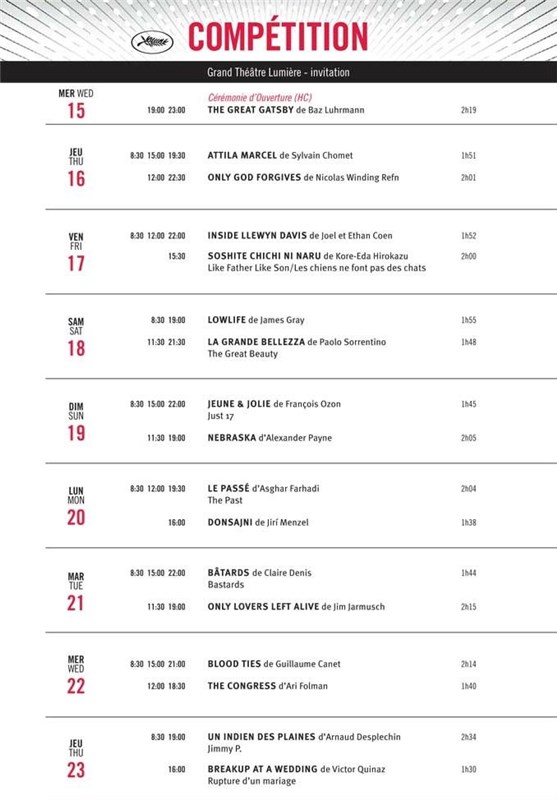 نکته جالب حضور فیلم «گذشته» اصغر فرهادی در میان فیلم‌های بخش مسابقه است. این در حالی است که اگر حضور فیلم این کارگردان ایرانی در بخش مسابقه رسما اعلام شود و لیست تغییری نکند وی برای به دست آوردن نخل طلا باید با فیلم جدید برادران کوئن، «فقط خدا می‌بخشد» فیلم نوآر نیکلاس ویندینگ رفن (کارگردان فیلم "درایو")، "زیبایی بزرگ" پائولو سورنتینو، "نبراسکا"ی الکساندر پین، "فقط عاشقان زنده می مانند" جیم جارموش و "مالاویتا"ی لوک بسون رقابت کند.