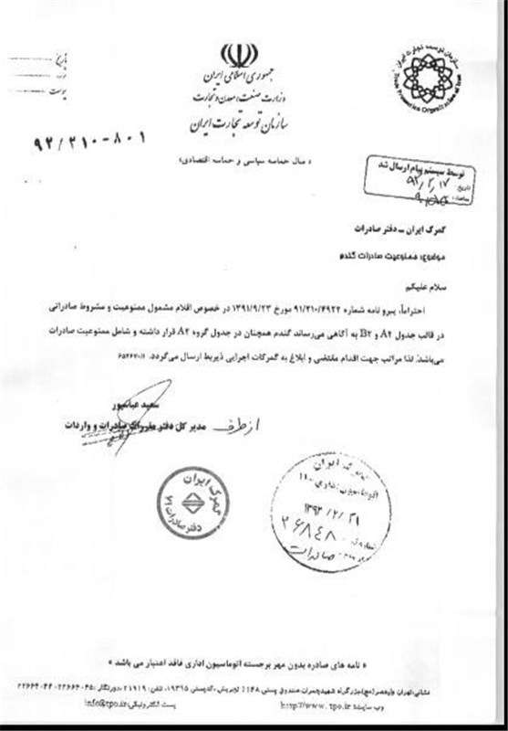 به‌گزارش خبرنگار اقتصادی خبرگزاری تسنیم، در بخشنامه گمرک آمده است: پیرو بخشنامه شماره 178172/71/311 مورخ 26/09/91 موضوع فهرست کالاهای ممنوع و مشروط، به‌پیوست تصویر نامه شماره 801-210/92 مورخ 17/2/92 دفتر مقررات صادرات و واردات سازمان توسعه تجارت ایران ارسال و مجدداً تأکید می‌گردد: گندم همچنان در جدول A2 جدول ضمیمه بخشنامه پیروی قرار داشته صادرات آن ممنوع می‌باشد. لذا خواهشمند است ضمن اقدام لازم، مراتب را به کلیه واحدها و گمرکات تابعه نیز ابلاغ و بر حسن اجرای امر نظارت مستمر معمول دارند.