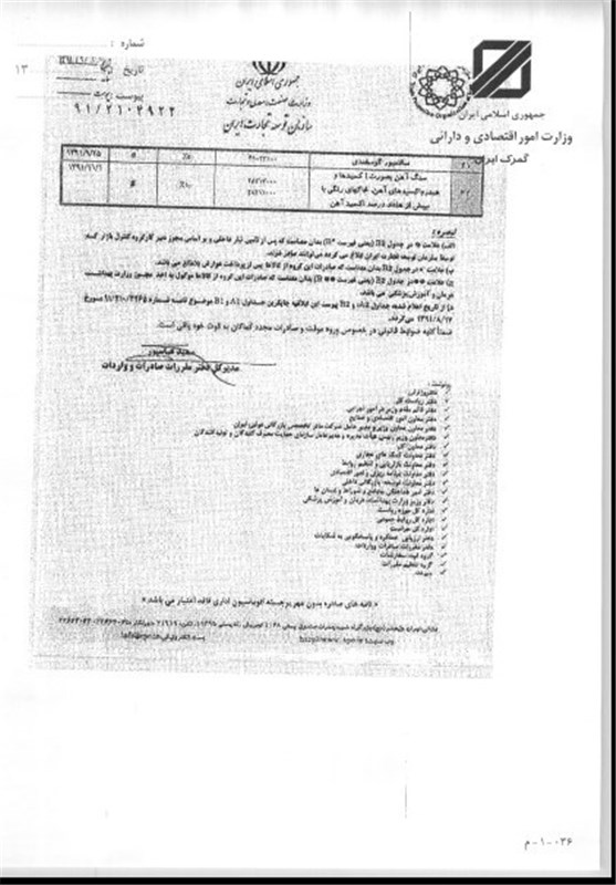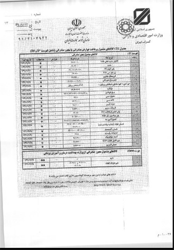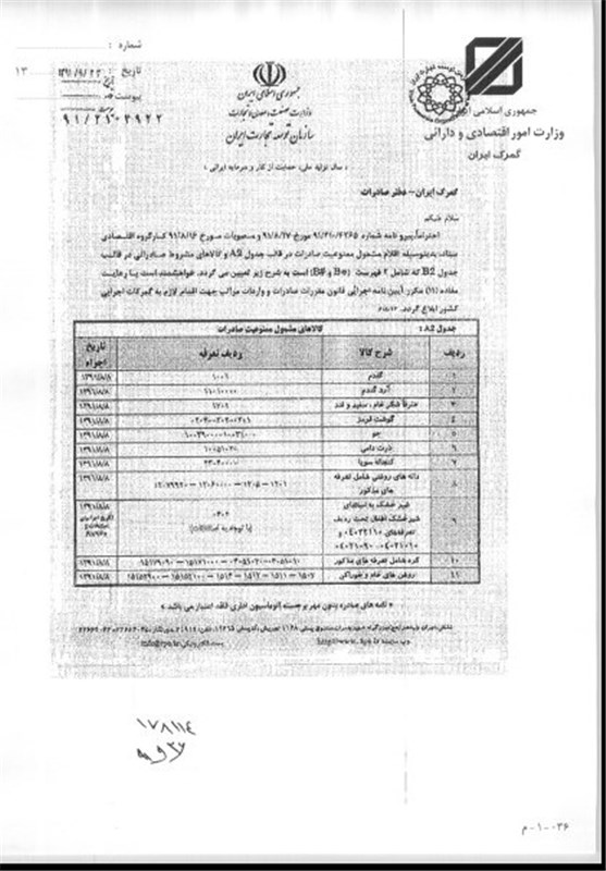 گمرک همچنین در بخشنامه دیگری تصریح کرد: پیرو بخشنامه شماره 157555/91/274 مورخ 22/8/91، به‌پیوست 5 برگ تصویر نامه شماره 2104922/91 مورخ 23/9/91 دفتر مقررات صادرات و واردات سازمان توسعه تجارت ایران در خصوص ممنوعیت‌ها و محدودیت‌های کالاهای صادراتی ارسال و اعلام می‌دارد: