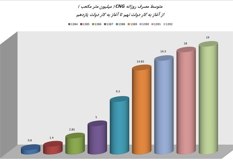 مقدار متوسط مصرف CNG در کشور در سال 84 (آغاز به کار دولت نهم) تنها 800 هزار مترمکعب در روز بود، این رقم در سال 85 به یک میلیون و 400 هزار مترمکعب در روز رسید.