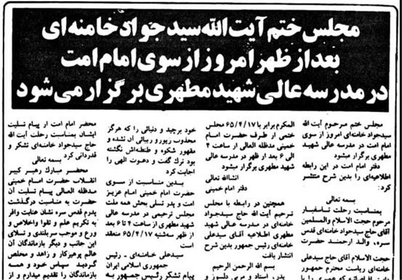 بدین مناسبت از سوی حضرت امام خمینی، امام عزیز امت و پدر تسلیبخش همۀ ملت، مجلس ترحیمی در مدرسۀ عالی شهید مطهری از ساعت 4 تا 6 بعدازظهر سه شنبه 65/4/17 منعقد است.