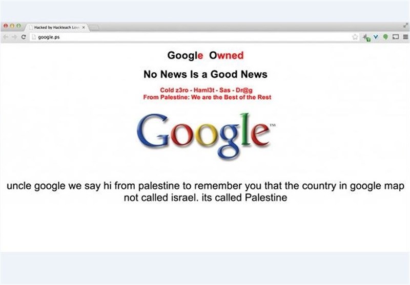 هکرهای پس از کنترل این صفحه عنوان Google Owned را بر روی آن گذاشته و پیامی بدین مضمون در آن درج کرده بودند: "عمو گوگل از فلسطین به شما سلام آوردهایم تا بیاد داشته باشید که آن کشور در نقشه گوگل نباید اسرائیل خوانده شود. نام آن فلسطین است."