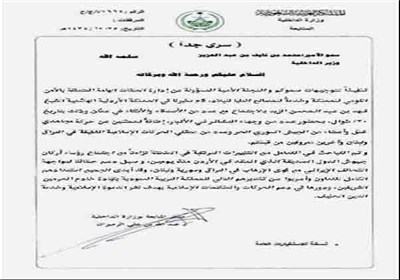 این نامه محرمانه از سوی یکی از روسای وزارت کشور عربستان سعودی به نام «عبدالله بن علی الرمیزان» به «شاهزاده محمد بن نایف بن عبدالعزیز»، وزیر کشور عربستان نوشته شده است.