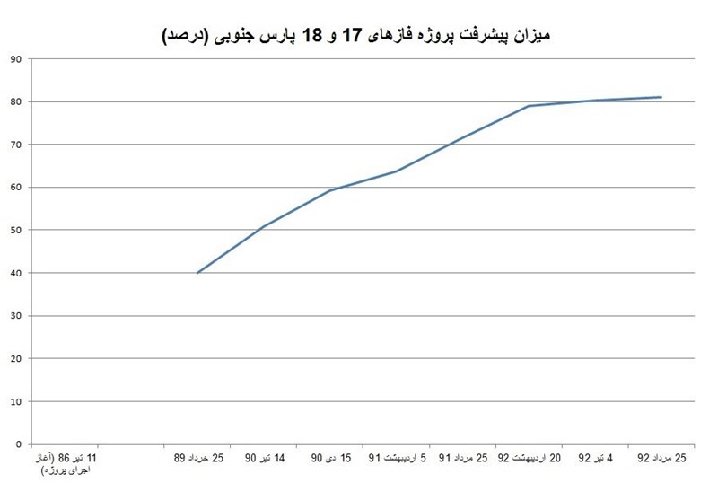 روند توسعه فازهای 17 و 18 پارس جنوبی نیز در 74 ماه گذشته وضعیت جالبی دارد. بر اساس گزارش هایی که در بازه های زمانی مختلف از پارس جنوبی به شرکت ملی نفت ایران ارائه شده است، نمودار مجموع پیشرفت فیزیکی پروژه فازهای 17 و 18 پارس جنوبی بدین صورت است:
