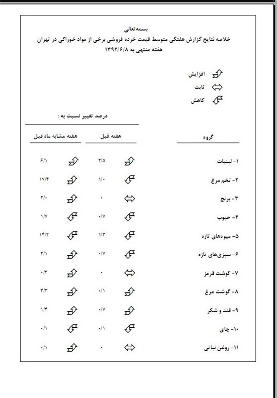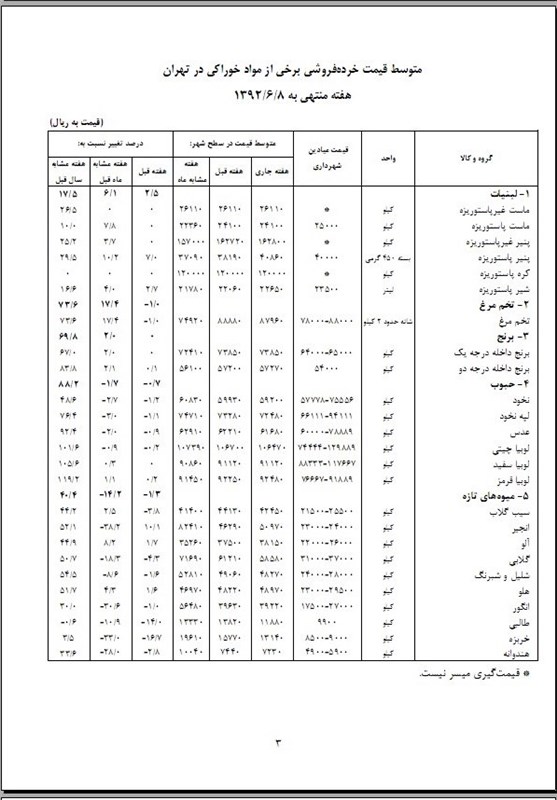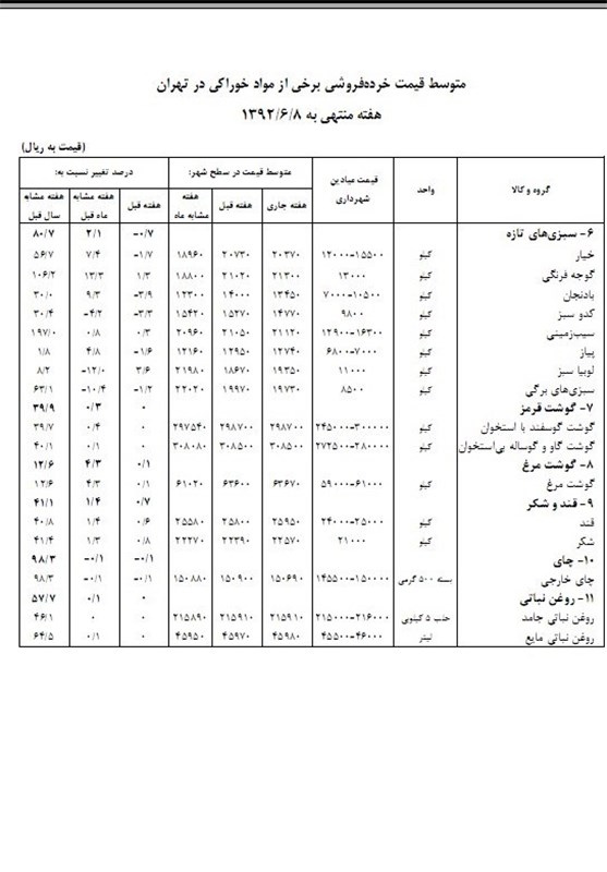 به گزارش خبرنگار اقتصادی خبرگزاری تسنیم، بانک مرکزی متوسط قیمت خرده فروشی برخی از مواد خوراکی در تهران هفته منتهی به 8 شهریور 1392 را منتشر کرد که بر اساس آن قیمت لبنیات 17.5 درصد، تخم مرغ 73.6 درصد، برنج 69.8 درصد، حبوب 88.2 درصد، میوههای تازه 40.4 درصد، سبزیهای تازه 80.7 درصد، گوشت قرمز 39.9 درصد، گوشت مرغ 12.6 درصد، قند و شکر 41.1 درصد، چای 98.3 درصد و روغن نباتی 57.7 درصد نسبت به سال گذشته افزایش یافته است.