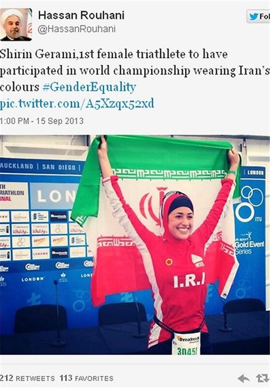 حجت الاسلام حسن روحانی رئیس جمهور کشورمان در پیامی که در صفحه شخصی توئیتر خود منتشر کرد با تمجید از دستاورد این ورزشگار نوشت: «شیرین گرامی اولین ورزشکار زن ایرانی است که در رقابتهای سهگانه قهرمانی جهان با پرچم ایران شرکت میکند.»