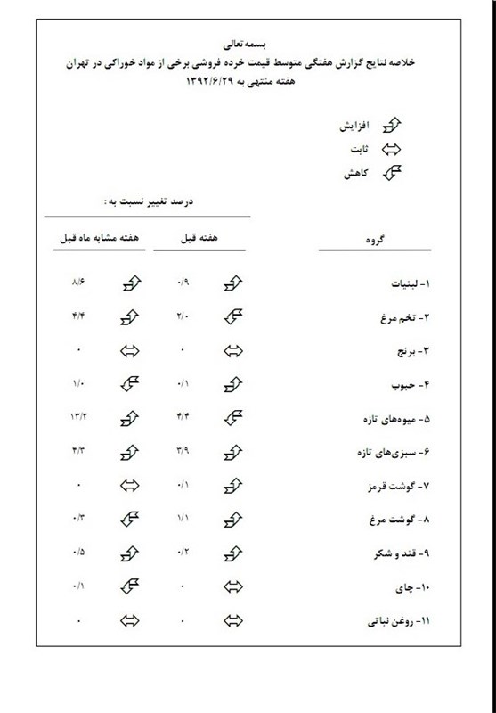 خلاصه نتایج گزارش هفتگی متوسط قیمت خرده فروشی برخی از مواد خوراکی
