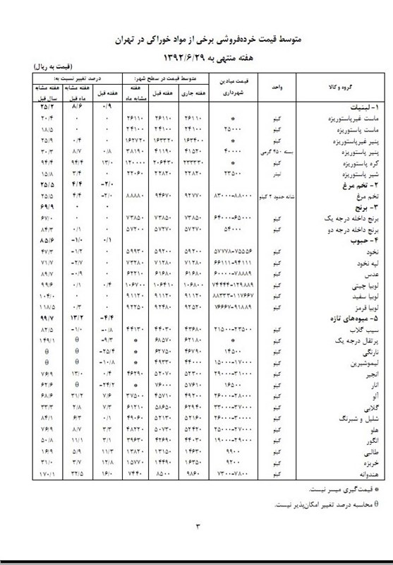 در هفته مورد گزارش، در گروه لبنیات قیمت پنیر پاستوریزه معادل 0.8 درصد و کره پاستوریزه 13.0 درصد افزایش یافت و بهای سایر اقلام این گروه نسبت به هفته قبل بدون تغییر بود. قیمت تخممرغ معادل 2.0 درصد کاهش داشت.
