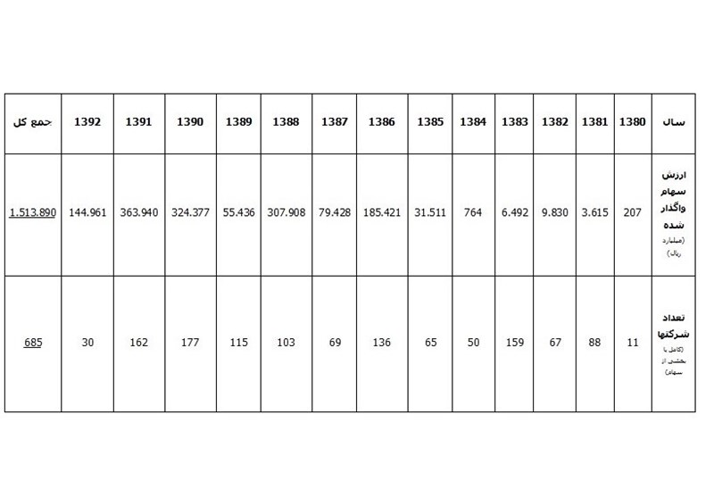 امام عملکرد شش رئیس، از ابتدای تاسیس سازمان خصوصی سازی در سال 80 تاکنون نشان می دهد 151 هزار میلیارد تومان سهم متعلق به 685 شرکت دولتی واگذار شده که به تفکیک از این قرار است: