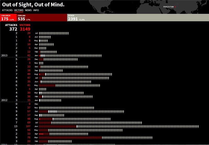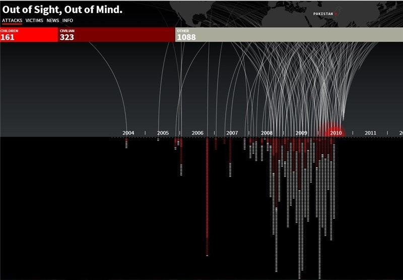 5. طبق یک نمودار دیگر، نموداری که تصویرش را در ادامه میبینید ما با یک همبستگی مستقیم دیگر روبهرو هستیم. این نمودار مربوط به سایتی تحت عنون «خارج از دید، خارج از ذهن» است و به ما نشان میدهد که اوباما علاقه زیادی به هواپیماهای بدون سرنشین دارد.از زمان شروع ریاست جمهوری او در سال 2009 حملات هواپیماهای بدون سرنشین به شدت افزایش پیدا میکند. به تبع این افزایش، کودکان پاکستانی کشته شده با این حملات هم طبیعتا افزایش پیدا میکنند. این نمودار از یک اینفوگرافیک متحرک در این آدرس به دست آمده است. سایتی که طراحی شده است تا به ما نشان دهد که برخلاف ادعای دولتمردان غربی 355 غیرنظامی و 175 کودک در جریان حملات این هواپیماهای بدون سرنشین در پاکستان کشته شدهاند.