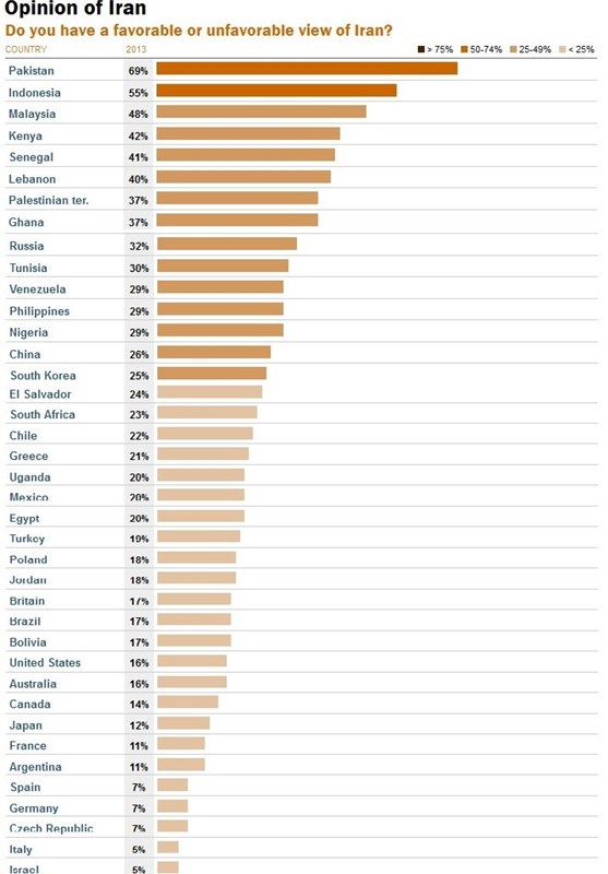 3. این نمودار، نظر سنجی «پروژه گرایشهای جهانی» در موسسه Pew Research یکی از معتبرترین مراکز نظرسنجی جهانی است. از مردم دنیا در مورد ایران سوالاتی پرسیدهاند و طبق این سوالات محبوبیت کشور ایران در میان مردم کشورهای مختلف را ارزیابی کردهاند. طبق این نمودار، جمهوری اسلامی ایران در کشور پاکستان از بقیه جاهای دیگر دنیا بیشتر محبوبیت دارد. این نمودار نشاندهنده یک همبستگی مثبت است. بین پاکستانیها و ایرانیها از سوی پاکستانی ها. ایران و پاکستان همسایه و هممذهب هستند و هم زبان بودهاند.