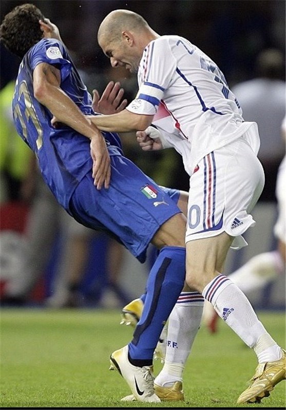 زین الدین زیدان، اسطوره و کاپیتان پیشین تیم ملی فرانسه در فینال جام جهانی 2006 پس از آنکه از سوی مارکو ماتراتزی، مدافع تیم ملی ایتالیا مورد اهانت مورد واقع شد، با سر به سینه او کوبید و با دریافت کارت قرمز مستقیم از زمین بازی اخراج شد و پس از آن اتفاق به حرفه ملی خود پایان داد.
