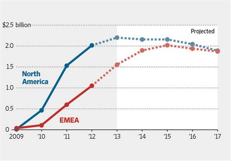 گفته میشود که میزان این سرمایهگذاریها تا سال 2015 به 2 میلیارد دلار خواهد رسید در حالیکه همین رقم سرمایهگذاریها در آمریکای شمالی در این سال، 2.2 میلیارد دلار خواهد بود.
