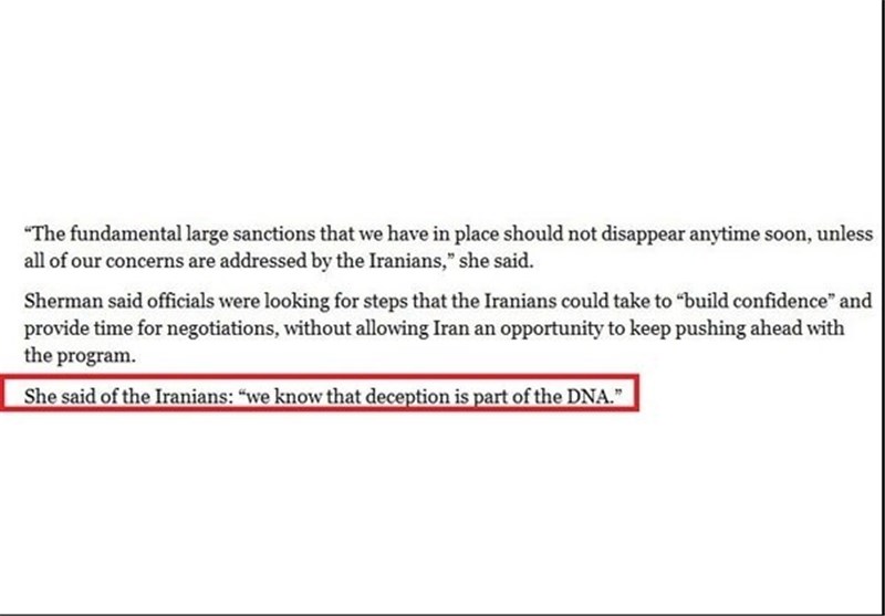 مذاکرهکننده عضو ارشد آمریکا در 1+5 میگوید: فریب و نیرنگ قسمتی از DNA ایرانیان است.