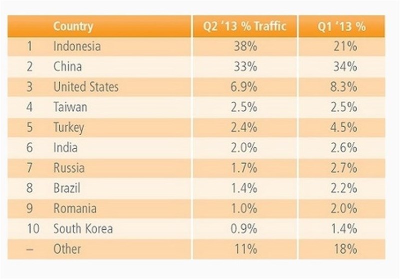 در گزارش این بازه زمانی، بالغ بر 89 درصد از کل حملات اینترنتی به 10 کشور صدر جدول مربوط شده که این میزان برای سه ماهه اول نزدیک به 82 درصد بود.