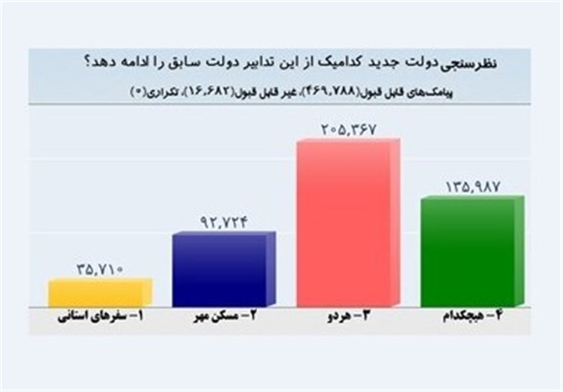 در پایان این نظرسنجی که حدود نیم میلیون شرکت کننده داشت 205 هزار و 355 نفریعنی حدود 44 درصد از شرکت کنندگان گزینه 3 را انتخاب و اعلام کردند که خواهان ادامه هم سفرهای استانی و هم مسکن مهر از سوی دولت جدید هستند . 8 درصد گزینه یک یعنی سفرهای استانی ، 20 درصد به گزینه دو یهنی مسکن مهر و 29 درصد به گزینه چهار یعنی هیچکدام رای دادند .