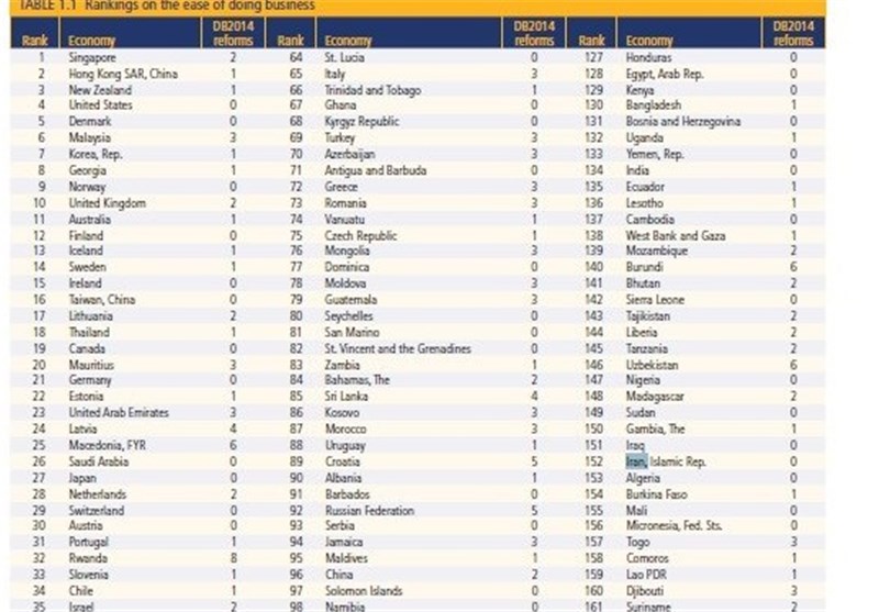 به گزارش خبرگزاری تسنیم، بانک جهانی در تازه‌ترین گزارش خود موسوم به «گزارش فضای کسب و کار 2014» به مقایسه 189 کشور جهان از نظر سهولت فعالیت‌های اقتصادی و وضعیت فضای کسب و کار آنها پرداخته است.