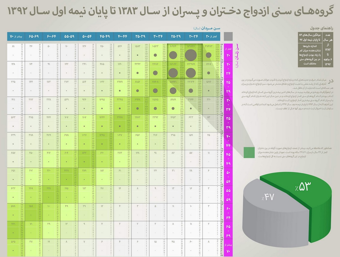 در اینفوگرافیک زیر میتوانید نگاهی داشته باشید به ازدواجهای صورت گرفته بین دختران و پسران کمتر از 20 تا بیشتر از 70 سال در سالهای 1383 تا پایان نیمه اول سال 1392 در کل کشور، بر اساس آمارهای ارائه شده سازمان ثبت احوال.