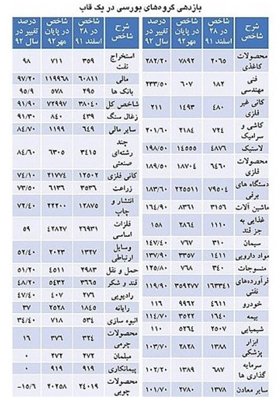 بر این اساس در این شرایط هنوز نمیتوان گفت که بازدهی بازار مسکن منفی بوده است، اما میتوان گفت که این بازار مطابق با تورم پیش رفته است. در گروههای بورسی چه خبر بود؟ شاخص بورس اوراق بهادار تهران در 7ماهه گذشته از سال بازدهی 9/91 درصدی را به ثبت رسانده، در حالی که بازدهی بازار ارز ،طلا و مسکن در این مدت منفی بوده و سپرده بانکی نیز در این دوره 7ماهه سود 12 درصدی نصیب سرمایه گذاران کرده است. همه این اتفاقات در شرایطی رخ می دهد که بازار سرمایه به طور متوسط در این مدت 9/91 درصد سود نصیب سهامداران نموده و تمامی بازارها را پشت سر گذاشته است.