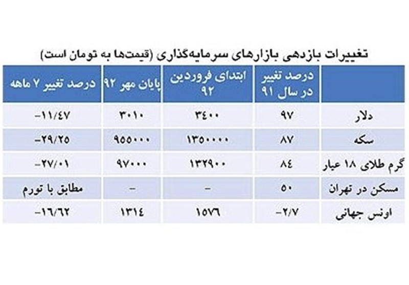بررسیها نشان میدهد که دلار آمریکا که قیمت 3 هزار و 400 تومانی را در ابتدای سال به خود دیده بود، در پایان مهرماه سال جاری قیمت 3 هزار و 10 تومانی را شاهد بوده است که این تغییرات به معنای افت 47/11 درصدی است، حال آنکه همین ارز حساس و مورد توجه سال گذشته به اندازه کل بازدهی کنونی بورس یعنی 97 درصد سود به سرمایهگذاران رسانده بود. در همین حال، سکه بهار آزادی که سال گذشته با رشد 87 درصدی خیل دارندگان نقدینگی را روانه سبزه میدان برای خرید کرده بود، از ابتدای سال جاری تاکنون زیانی برابر با 25/29 درصد را نصیب خریدارانش کرده و قیمت یک میلیون و 350 هزار تومانی این مسکوک پرطرفدار به 955 هزار تومان در پایان مهر 92 رسیده است. هر گرم طلای 18 عیار ایرانی هم در این مدت همسو با دلار و سکه چیزی جز زیان نصیب سرمایهگذاران نکرده است و نمایشگر قیمت طلای 18 عیار پرطرفدار ایرانیان از افتی معادل 27 درصد در 7 ماه گذشته از سال حکایت میکند و قیمت هر گرم طلا هم از عدد 132 هزار و 900 تومان اول سال به 97 هزار تومان تا پایان مهرماه سال جاری رسیده است.