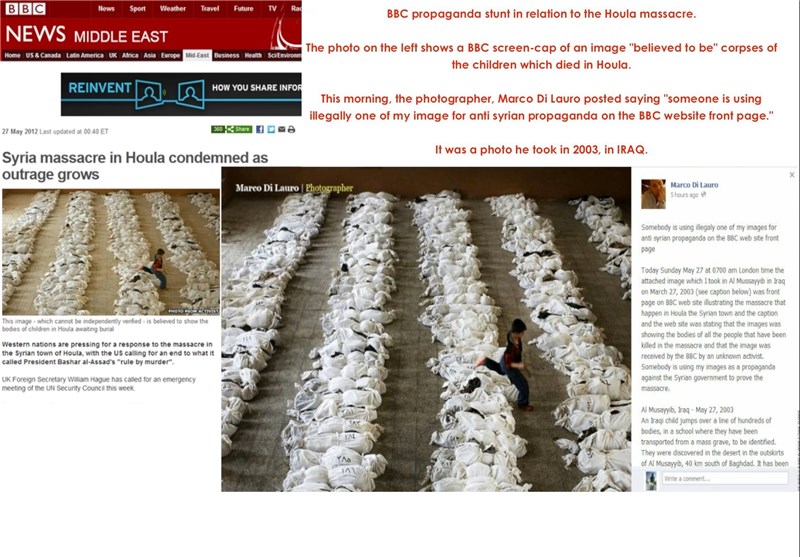 3. بی.بی.سی دو سال پیش  تصاویر دلخراشی را از آنچه که خودش کشتار وحشیانه در سوریه نامید پخش کرد. نیاز به جستجوی خیلی زیادی نبود. خیلی زود معلوم شد که تصاویر هشداردهنده اخیر بی‌بی‌سی از قربانیان کشتار دسته جمعی در سوریه که به عنوان نشانه ای برای اثبات دست داشتن دولت در این کشتارها نشان داده شد تصاویری بود که از آرشیو خود بی‌بی‌سی از یک کشتار  دسته جمعی در عراق در سال 2003 برداشته شده بود. آن هم کشتاری که در جریان تهاجم و اشغال غیرقانونی آمریکا وانگلستان رخ داده بود. توجیه بی.بی.سی در نوع خود جالب بود: "باید بیشتر دقت می شد"