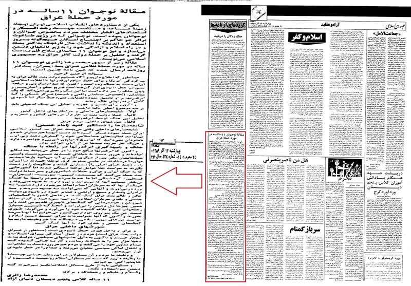 موضعی که من همیشه داشتهام و اکنون نیز دارم همین است. این یک رویکرد است: اولین چیزی که از من چاپ شده در نشریات مرگ بر امریکا و تقابل با این اجرا است. لیدی که آن مطلب آن موقع داشت چنین است: یکی از دستاورهای انقلاب اسلامی ایران، ایجاد زمینه مساعد و مناسب جهت رشد افکار و استعدادهای اقشار مخلف مردم بخصوص جوانان بوده است. نوجوانی که در رژیم طاغوت بر اثر جو حاکم بر اجتماع امکان هیچگونه بروز استعداد و اندیشه را نداشت، حال نارنجک به کمر بسته و در راه اسلام و آزادگی خود را به زیر تانکهای دشمن میاندازد و نیز نوجوان 11 سالهای سلاح قلم به دست گرفته و تحلیل خود بر حمله دولت کافر عراق به جمهوری اسلامی مینویسد (شماره 434 روزنامه جمهوری اسلامی» (چهارشنبه، 12 آذرماه 1359 برابر با 24 محرم 1401) با عنوان «مقاله نوجوان 11 ساله در مورد حمله عراق»).