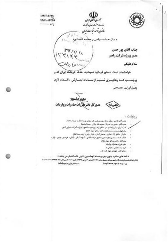به گزارش خبرنگار اقتصادی خبرگزاری تسنیم، در بخشنامه فرود عسگری به ادارات گمرک آمده است: پیرو بخشنامههای منتهی به شماره 70723/91/50201/103/2945/73/121 مورخ 20/4/1391 و 103321/91/95517/103/2945/73/188 مورخ 12/6/1392، بهپیوست تصویر رونوشت نامه شماره 4348/210/92 مورخ 21/7/1392 ادارهکل مقررات صادرات و واردات سازمان توسعه تجارت ایران مبنی بر حذف دریافت ایرانکد و برچسب شبنم در سامانه ثبتارش جهت اطلاع و اقدام با رعایت سایر مقررات ارسال و اعلام می دارد کلیه بخشنامههای پیروی فوق الذکر لغو میگردند.