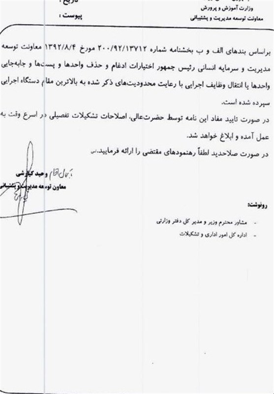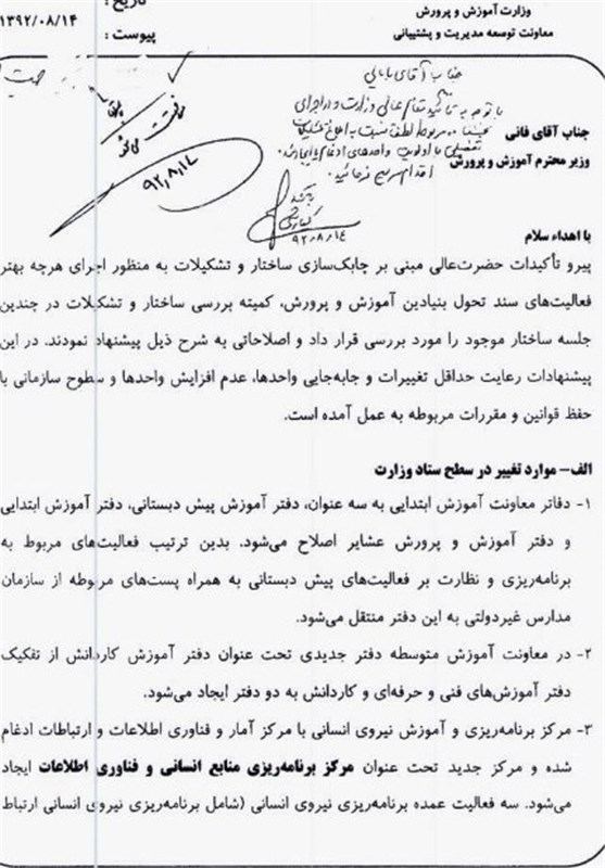 دستور فانی برای تغییر درمعاونت ابتدایی و متوسطه/ایجاد مرکز جدید منابع انسانی و فناوری اطلاعات+تصویر