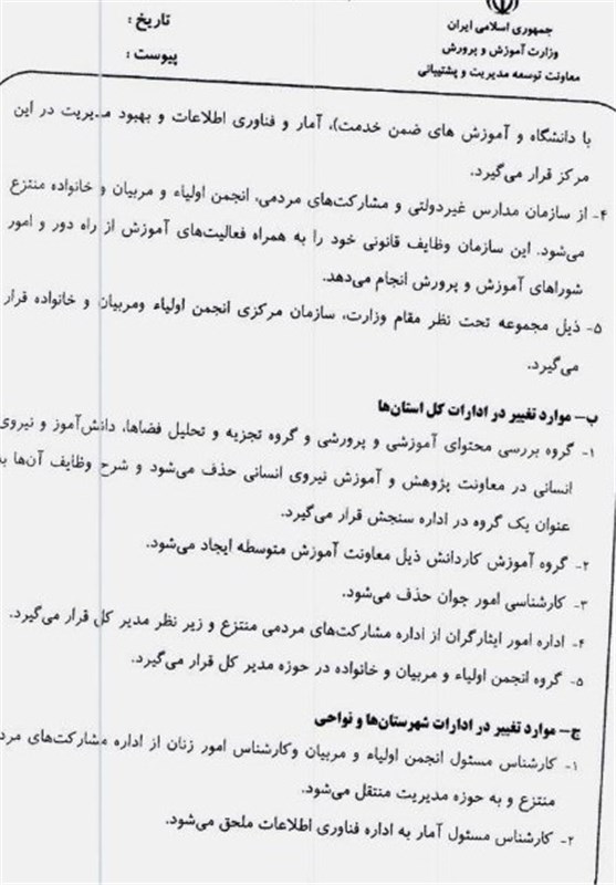 کارشناس مسئول انجمن اولیا و مربیان و کارشناس امور زنان از اداره مشارکت‌های مردمی منتزع و به حوزه مدیریت منتقل می‌شود.
