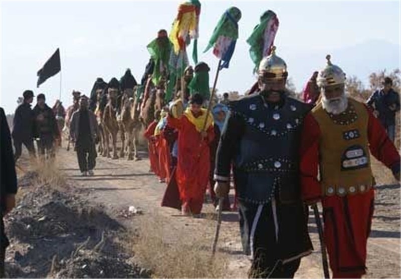 در این مراسم کاروانی سبزپوش با تعدادی اندک و تجهیزات کمتر که در میانه راه کاروانی سرخپوش با تجهیزات کامل نظامی و سواران شمشیر بهدست به نشان نظامیان یزید به فرماندهی حر آنها را تعقیب میکنند تا آنجا که کاروان حسینی را به بیابانی رهنمون میشوند و کاروان حسینی را کودکانی در لباس فرشتگان بدرقه میکنند.
