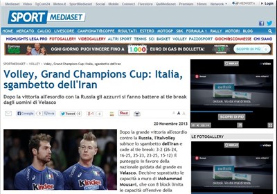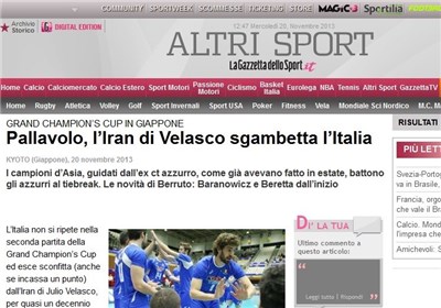در همین حال سایت اینترنتی روزنامه معروف کوریره دلواسپورت نیز در گزارشی تحت عنوان «همچنان شگفتی میآفریند» درباره این بازی نوشته است:« آتزوری در تایبرک تسلیم ایران، تیم تحت هدایت سرمربی سابق آتزوری شد. تیم ولاسکو که در بازی اول خود مقابل برزیل مغلوب شد در دومین بازی خود ایتالیا را تسلیم کرد. ایتالیا همواره در نتیجه بازی در تعقیب ایران بود. در دور شدن ایتالیا از رویای قهرمانی، تک ستاره ایران محمد موسوی بود که 8 امتیاز از 17 امتیازش در این بازی را از دفاع روی تور گرفت. در سومین ست نیز ایران که چند ماه پیش نیز در رقابتهای لیگ جهانی ایتالیا را شکست داده بود به لطف عملکرد غلامی موفق شد بازی را به سود خود به پایان برساند.»