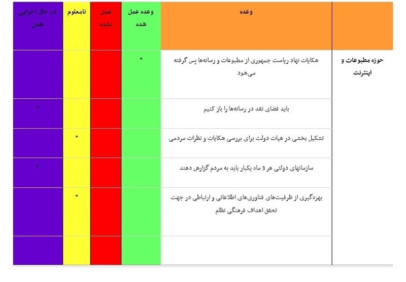 البته حجتالاسلام روحانی وعده داده بود که دستگاههای اجرایی هر 3 ماه یکبار میزان اجرایی شدن وعدههای ریاستجمهوری را باید به مردم اعلام کنند و در عین حال نهادی نیز در هیات دولت برای «شکایات و نظرات مردمی» تشکیل خواهد شد.