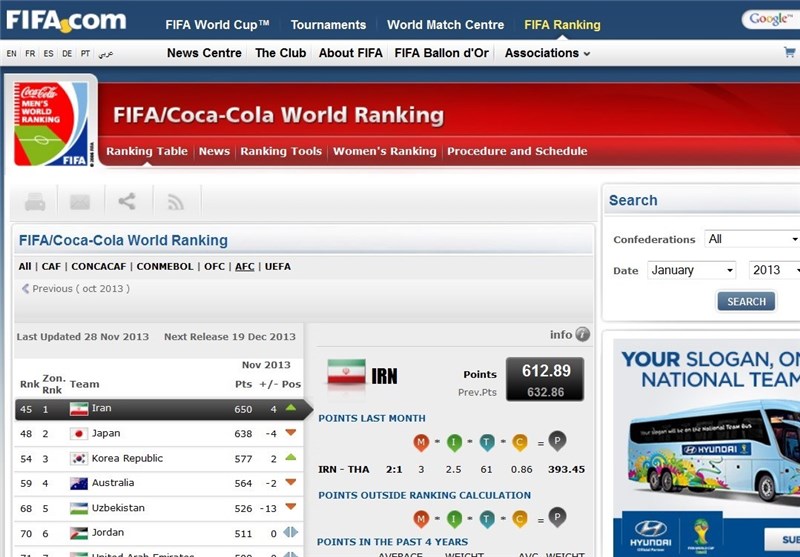 به گزارش خبرگزاری تسنیم، سایت فدراسیون جهانی فوتبال (فیفا) امروز (پنجشنبه) آخرین ردهبندی برترین تیمهای ملی فوتبال دنیا مربوط به ماه نوامبر را اعلام کرد که در این ردهبندی تیم ملی فوتبال ایران با 5 پله صعود نسبت به ردهبندی ماه اکتبر و با 650 امتیاز در رده چهل و پنجم جهان قرار گرفت و در میان تیمهای آسیایی نیز پس از مدتها رتبه نخست را به خود اختصاص داد.