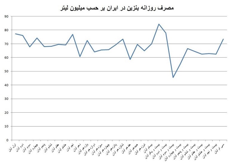 نوسانات روزانه و جزئیات مصرف روزانه بنزین در ایران در آبان ماه سال جاری در قالب نمودار بدین شرح است: