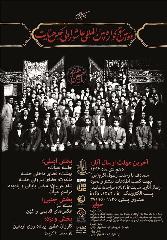 دهم دی ماه 1392 مصادف با رحلت رسول اکرم(ص) آخرین مهلت ارسال آثار پوستر و عکس است. برای شرکت در سوگواره میتوانید از طریق نشانی اینترنتی www.soog1542.comثبتنام فرمایید.