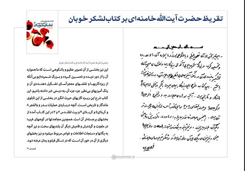 تقریظ مقام معظم رهبری پشت جلد چاپ چهاردهم کتاب «لشکر خوبان» را به خود مزین کرده است و علاقمندان می توانند نوشتههای مقام معظم رهبری را با دست خط معظمله مشاهده کنند.