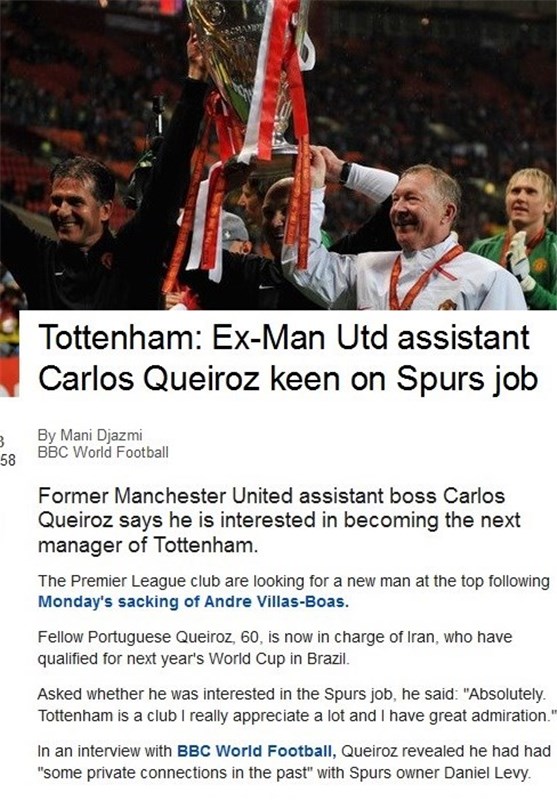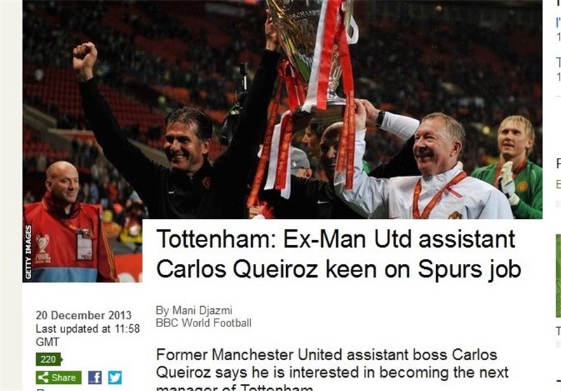کارلوس کی‌روش، سرمربی 60 ساله تیم ملی کشورمان که این تیم را به جام جهانی 2014 برزیل رسانده است در پاسخ به این پرسش که «اصلاً علاقه‌ای به سرمربیگری تاتنهام دارید؟»، به شبکه تلویزیونی بی‌بی‌سی انگلیس گفت: قطعاً همینطور است. تاتنهام تیمی است که خیلی تقدیرش می‌کنم و احترام خاصی برای آن قائلم.