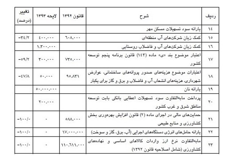 مقایسه اعتبار یارانه 23 ردیف در قانون بودجه 92 و لایحه بودجه 93 در جداول زیر آمده است: