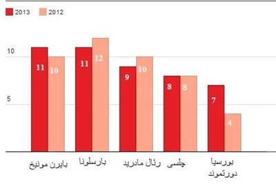 در فهرست 100 بازیکن برتر نشریه گاردین، تیمهای بایرن مونیخ و بارسلونا بیشترین نماینده را دارند به طوری که 11 بازیکن ترکیب اصلی این 2 تیم (مسی، اینیستا، نیمار، ژاوی، سرخیو بوسکتس، سسک فابرگاس، جرارد پیکه، دنی آلوز، خاویر ماسچرانو، ویکتور والدس و الکسیس سانچس از بارسلونا و مانوئل نویر، داوید آلابا، تونی کروس، داوید آلابا، ماریو ماندزوکیچ، دانته، خاوی مارتینس، فرانک ریبری، آرین روبن، فیلیپ لام، باستین شواین اشتایگر، توماس مولر از بایرن مونیخ) در این فهرست قرار دارند. از رئال مادرید هم 9 بازیکن در این فهرست هستند که این بازیکنان عبارتند از: کریستیانو رونالدو، گرث بیل، ژابی آلونسو، سرخیو راموس، کریم بنزما، مارسلو، لوکا مودریچ، آنخل دیماریا و ایسکو.