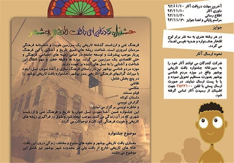 وی از برگزاری جشنواره کودکانه در بافت تاریخی بوشهر خبرداد و گفت: اداره کل میراث فرهنگی، صنایع دستی و گردشگری استان بوشهر جشنواره کودکانههای بافت تاریخی بوشهر را در شش بخش نقاشی، عکاسی، فیلم، داستان نویسی، گزارش نویسی و خاطره نویسی را برای رده سنی زیر 14 سال برگزار میکند.