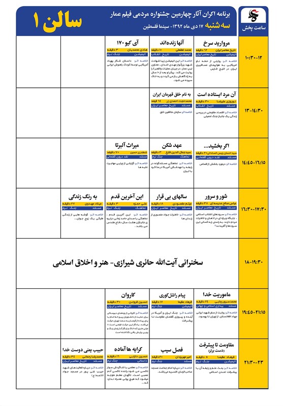 خبرگزاری تسنیم: برنامه اکران فیلم‌های چهارمین جشنواره مردمی فیلم عمار در سه سالن نمایش سینما فلسطین برای روز سه شنبه 17 دی‌ماه مشخص شد.
