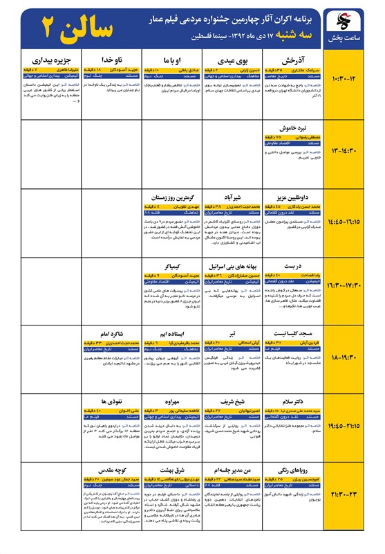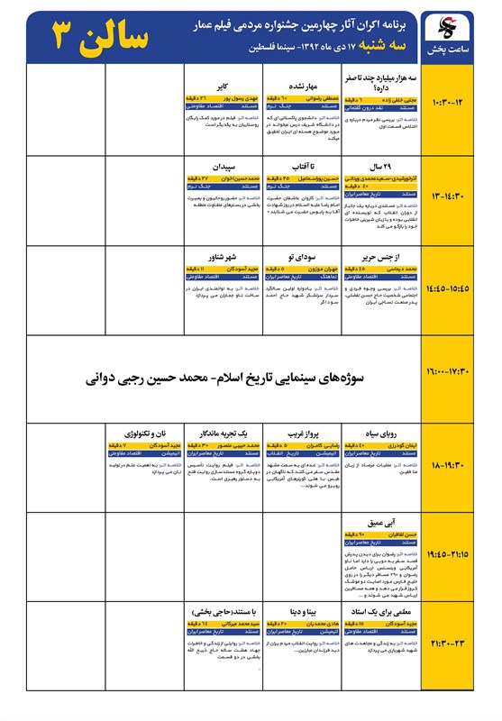 به گزارش خبرگزاری تسنیم، برنامه اکران فیلمهای چهارمین جشنواره مردمی فیلم عمار در سه سالن نمایش سینما فلسطین برای روز سه شنبه 17 دی‌ماه مشخص شد. برنامه کامل اکران‌های این روز را در ادامه ببینید.