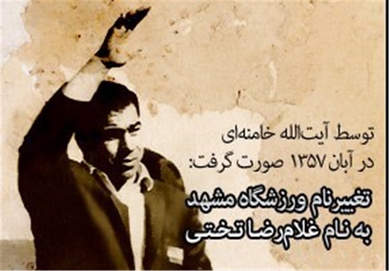 برادران ما، هم جامعهى معلمین، که میزبانان ما و میزبانان بسیار عزیز ما هستند و سپاس همهى ما بر آنها و نثار آنها و همچنین جامعهى ورزشکاران و به خصوص کشتىگیران پیشنهاد کردند، من این پیشنهاد را در معرض میل و دید برادران و خواهران مىگذارم، اگر خواستید تصویب مىکنید و اگر تصویب کردید، حق با مردم است، حق با ملت است، همان، خواهد شد. پیشنهاد مىکنند که این استادیوم را به نام پهلوان غلامرضاى تختى نامگذارى کنید. بهتر از این «صحیح است» و بهتر از این تصدیق، هیچ عامل و موجبى براى چنین نامگذاریهایى وجود ندارد. غالباً نامگذاریها بر اساس یکسِرى اعمال غرضها و اعمال نفوذها و یکسرى تصمیمهاى فردى انجام گرفته. در هیچ نامگذارىاى این همه آحاد جمعیت یکزبان و یکنفس تصمیم نگرفتند و حالا که شما تصمیم گرفتید، حالا که خواستید، من با اجازهى شما و از طرف همهى مرد و زنى که در اینجا حضور دارند و نیز چند برابر این جمعیت که امروز راه بر آنها بسته شد و به آنها اجازهى شرکت در این مجلس داده نشد و مىدانم همه با ما همصدا هستند، با اجازهى همهى شما و از طرف همهى شما این محل را نامگذارى مىکنم به استادیوم غلامرضاى تختى.» 1357.8.16