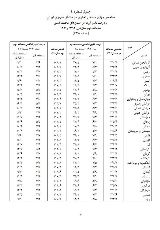در آمار محاسبه شده توسط بانک مرکزی آمده است که شاخص بهای مسکن اجاری در سه ماهه دوم سال 92 نسبت به سه ماهه قبل، در کلیه استانهای کشور افزایش یافت. بیشترین میزان افزایش متعلق به استان کرمانشاه معادل 9 درصد بود و استانهای تهران و آذربایجان غربی به ترتیب با 8.9 درصد و 8.3 درصد افزایش در رده های بعدی قرار گرفتند.
